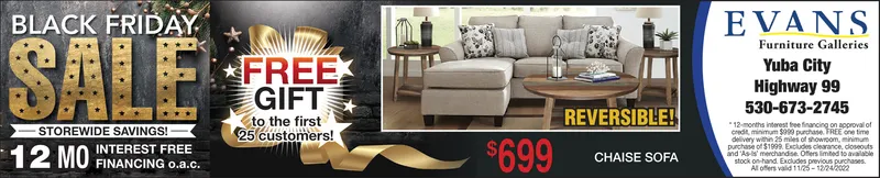 BLACK FRIDAY SALE -STOREWIDE SAVINGS! 12 MO INTEREST FREE FINANCING o.a.c. FREEX GIFT to the first 25 customers! $699 REVERSIBLE! CHAISE SOFA EVANS Furniture Galleries Yuba City Highway 99 530-673-2745 *12 months interest free financing on approval of credit, minimum $999 purchase. FREE one time delivery within 25 miles of showroom, minimum purchase of $1999. Excludes clearance, closeouts and "As is merchandise. Offers limited to available stock on-hand. Excludes previous purchases. All offers vald11/25-12/24/2022 BLACK FRIDAY SALE -STOREWIDE SAVINGS ! 12 MO INTEREST FREE FINANCING o.a.c. FREEX GIFT to the first 25 customers ! $ 699 REVERSIBLE ! CHAISE SOFA EVANS Furniture Galleries Yuba City Highway 99 530-673-2745 * 12 months interest free financing on approval of credit , minimum $ 999 purchase . FREE one time delivery within 25 miles of showroom , minimum purchase of $ 1999 . Excludes clearance , closeouts and " As is merchandise . Offers limited to available stock on - hand . Excludes previous purchases . All offers vald11 / 25-12 / 24 / 2022